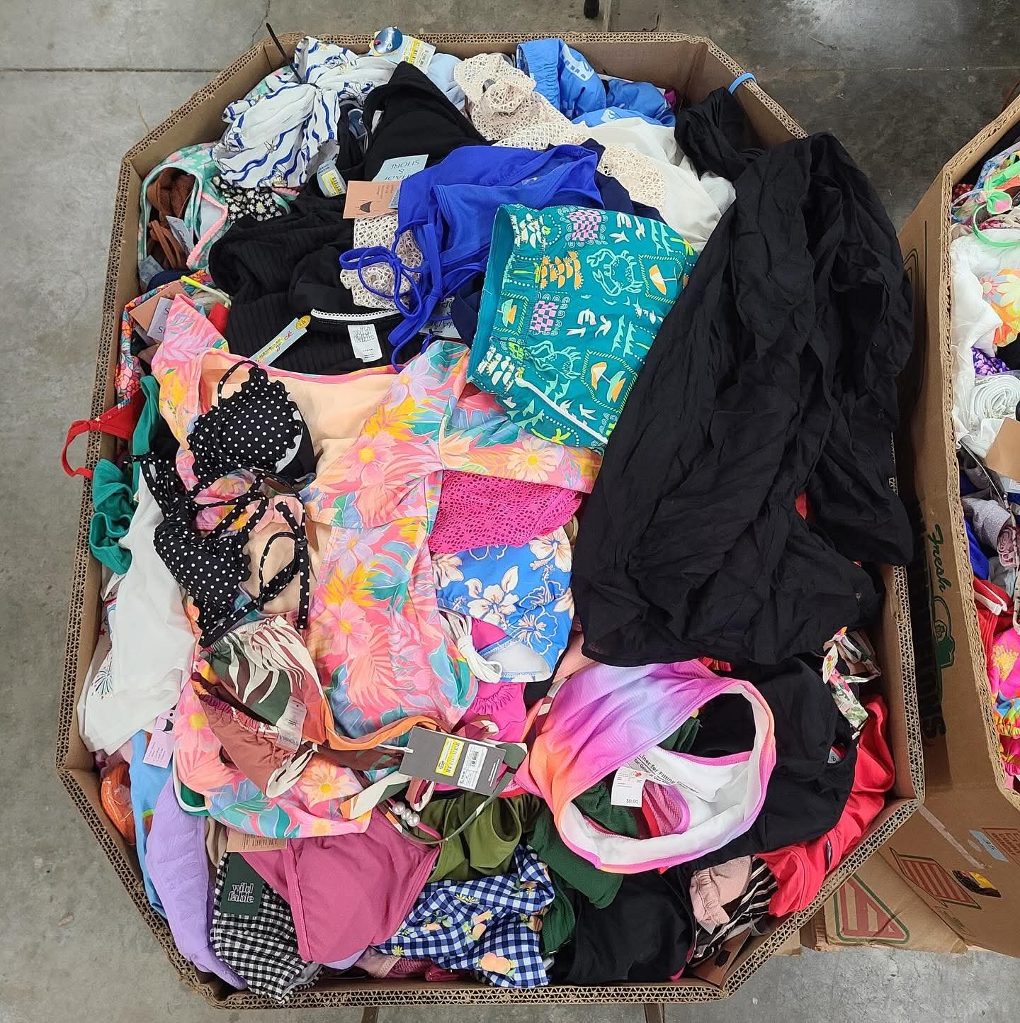 Includes 800–900 brand-name pieces of women’s, men’s, and kids’ swimwear. Perfect mix of bikinis, trunks, one-pieces, and more. Ideal for resellers — estimated resale value $4,500–$6,000. Available for shipping or pickup. Warehouse visits by appointment.